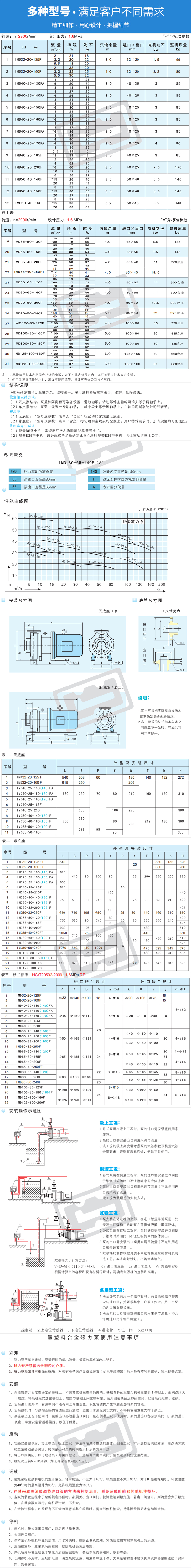 IMD系列氟塑料磁力泵,流量:1~160m3/h;楊程17~62m,適用于輸送強腐蝕,易燃、易爆、有毒、易揮發(fā)的化學(xué)介質(zhì)。適用溫度:-20℃~100℃。